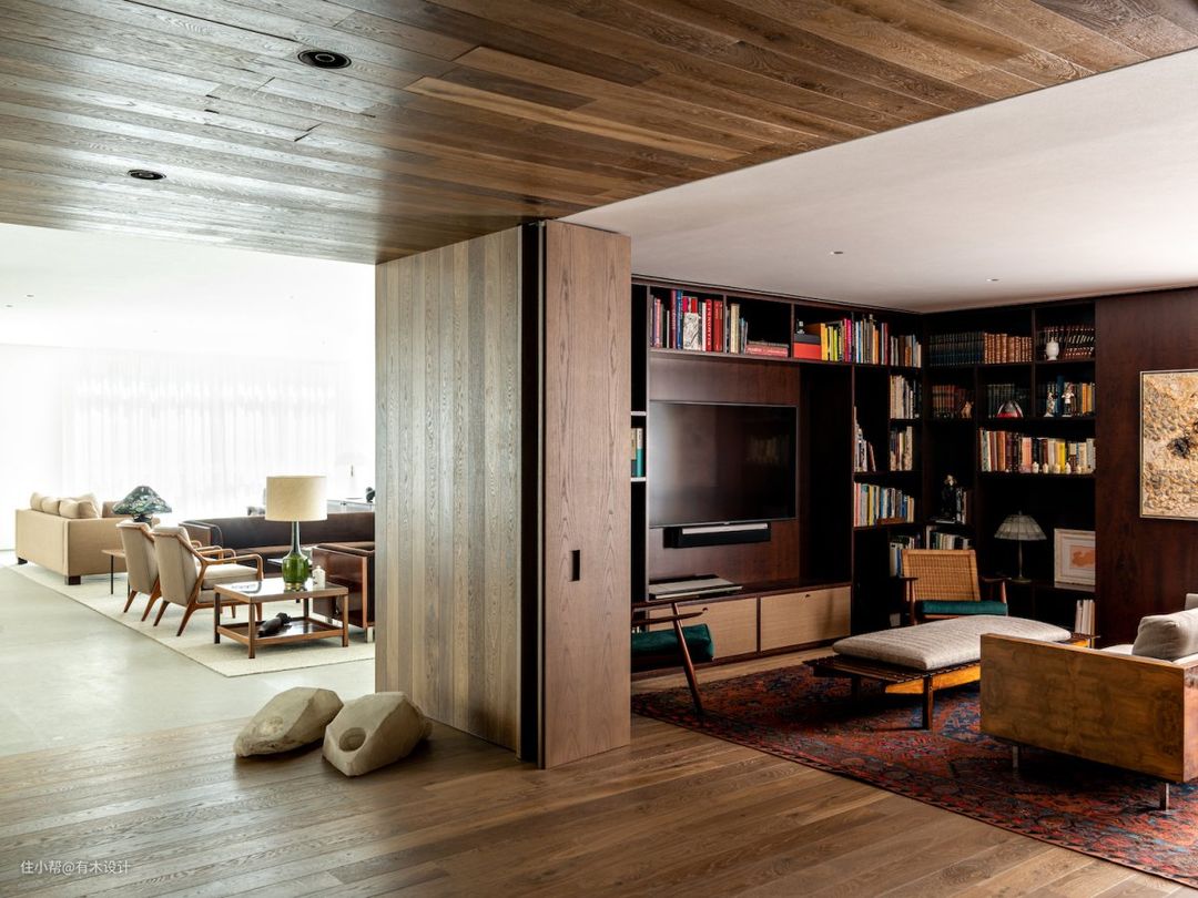 通常是一字形书柜,书柜造型简单,由同一款式的柜体单元重复而成的。这样的设计通常比较大气稳重,适合比较大的开放空间。