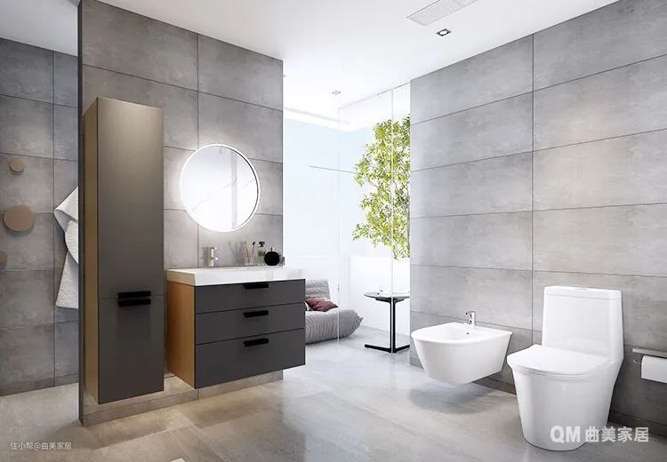 (灰色的瓷砖搭配白色的卫浴屡试不爽,简洁大方,也有层次感。)