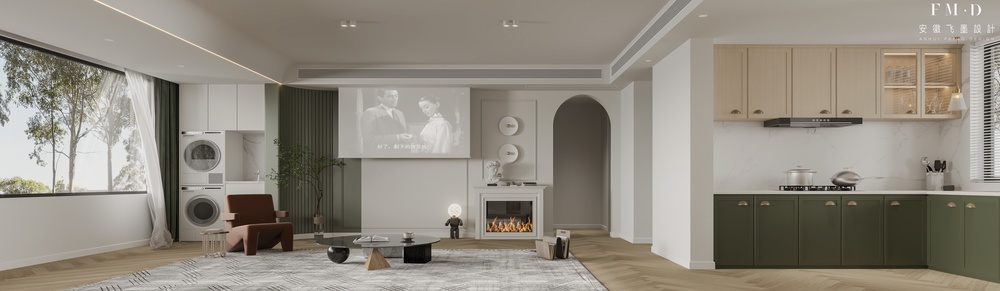 电视墙并不一定要装电视,用投影仪代替,满足在家有个影音室的需求。一边还做了个壁炉,满满的复古气息。业主要求有个好看的背景处理,分色墙+抽缝造型,简直美爆!