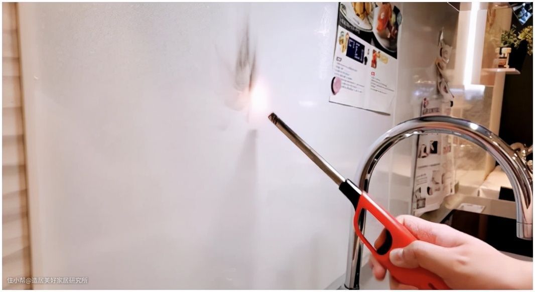 所以,它可以成为替代洞洞板的收纳神器,另外它的表面非常光滑,具有优良的防油防污防高温的优点,有油污只需要用抹布轻轻一擦就能洁净如初,而且珐琅板没有缝隙,也不用担心油污藏进缝隙里不好清洁,非常适合用在灶台背后的整面墙上;但需要注意那些磁铁性质的置物架也会有沾染上油烟的问题。