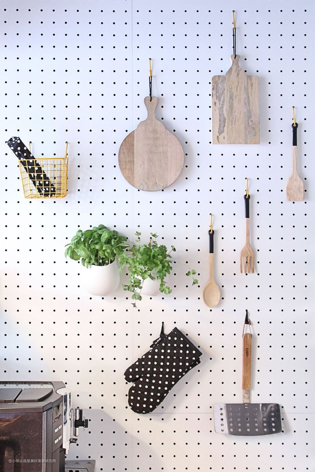 另外,厨房利用洞洞板上墙的物品也会受到油烟灰尘的侵袭(厨房置物架摆放也会遇到相同的问题)。