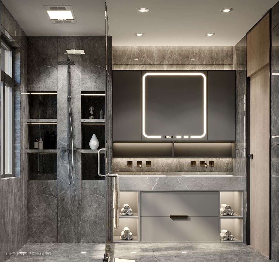 卫生间采用了灰色理石纹路墙砖,搭配岩板浴室柜,和客厅空间交相呼应,镜柜的设计增加了储物空间,让干区更具整洁美感,在淋浴区做壁龛再局部使用整砖铺贴,让淋浴区更有档次,还能房主在沐浴时方便拿去洗浴用品。