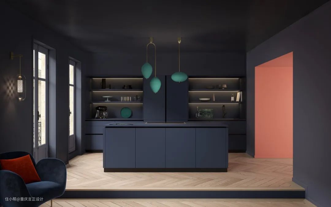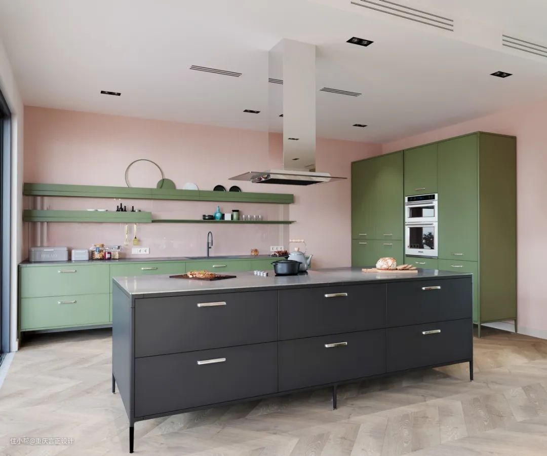 墙壁的颜色可以改变一切。想象一下,同样的空间有着画廊白色的背景,你会感受到一种完全不同的氛围,与纯黑的岛屿和中绿色的主体单元截然不同。独特的墙面颜色选择注入个性和个性。