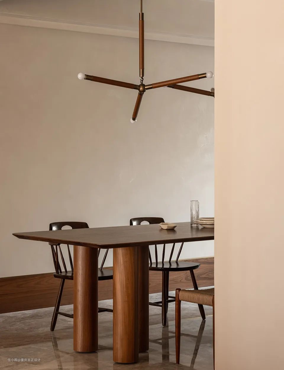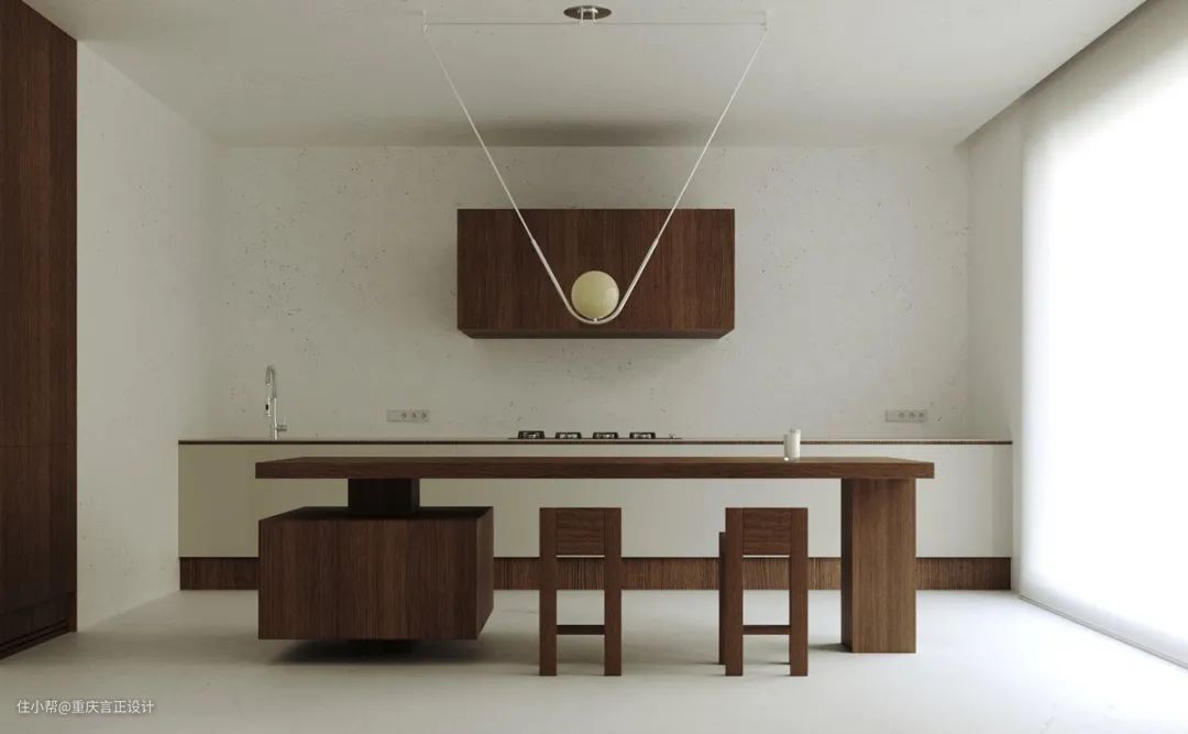 大胆而平衡。独一无二的厨房吊灯在一个平衡的胡桃木和白色厨房装置的中心,引人注目地落下一个朝上的球体。白色灯具与装在后面的独立胡桃木体积形成完美对比。