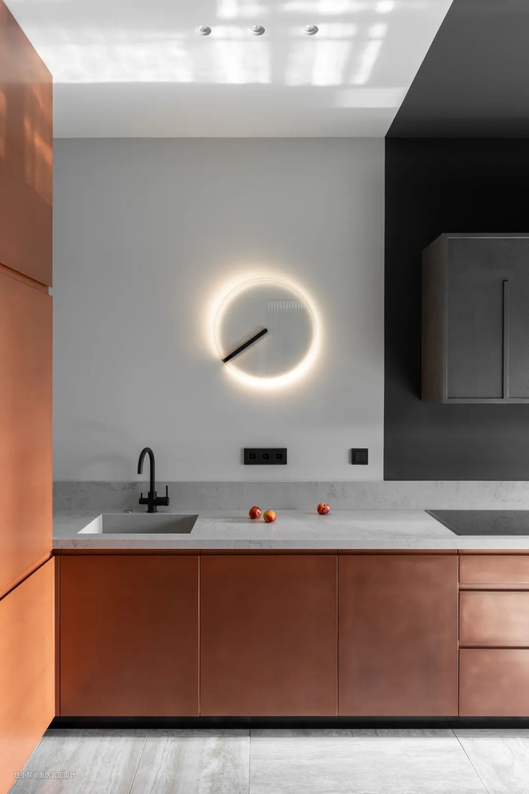 温暖的铜制单元与冷灰色的台面在这一鲜明的现代厨房设计中相遇。明亮的壁灯与金属光泽竞争。