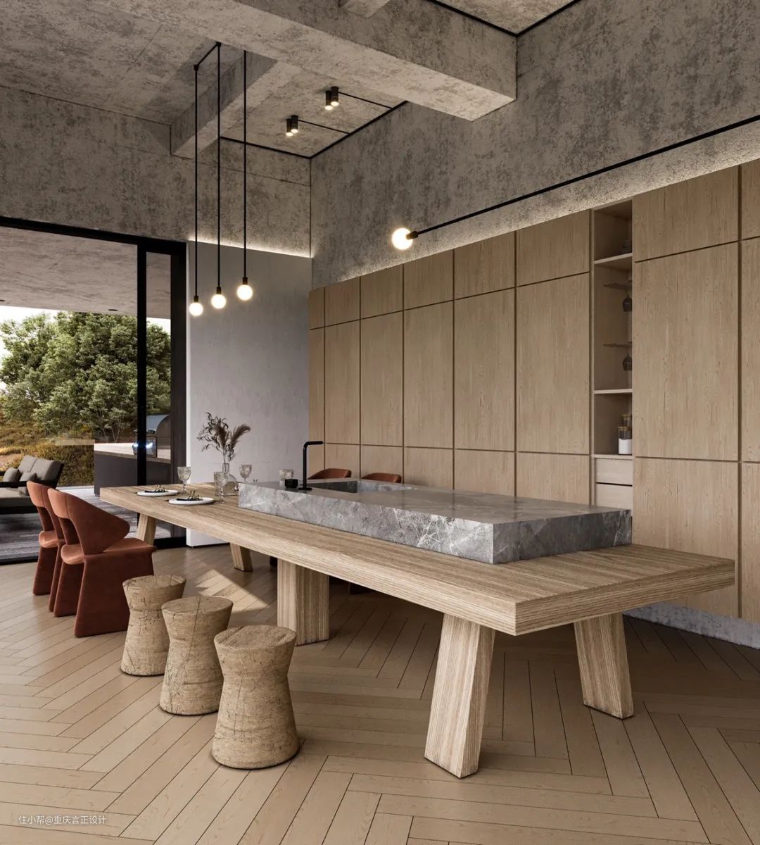 软木凳子和矮胖的木质餐桌让人想起现代乡村的审美在这个高端的厨房用餐空间。灰色的大理石台面将木桌的一端改造成一个带厨房水槽的功能岛。