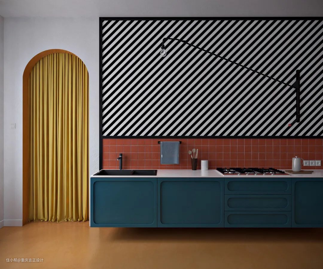 用曲线创造有趣的空间。时尚的曲线、拱门和跑道图案现在在室内场景中随处可见,这个造型优美的厨房也不例外。