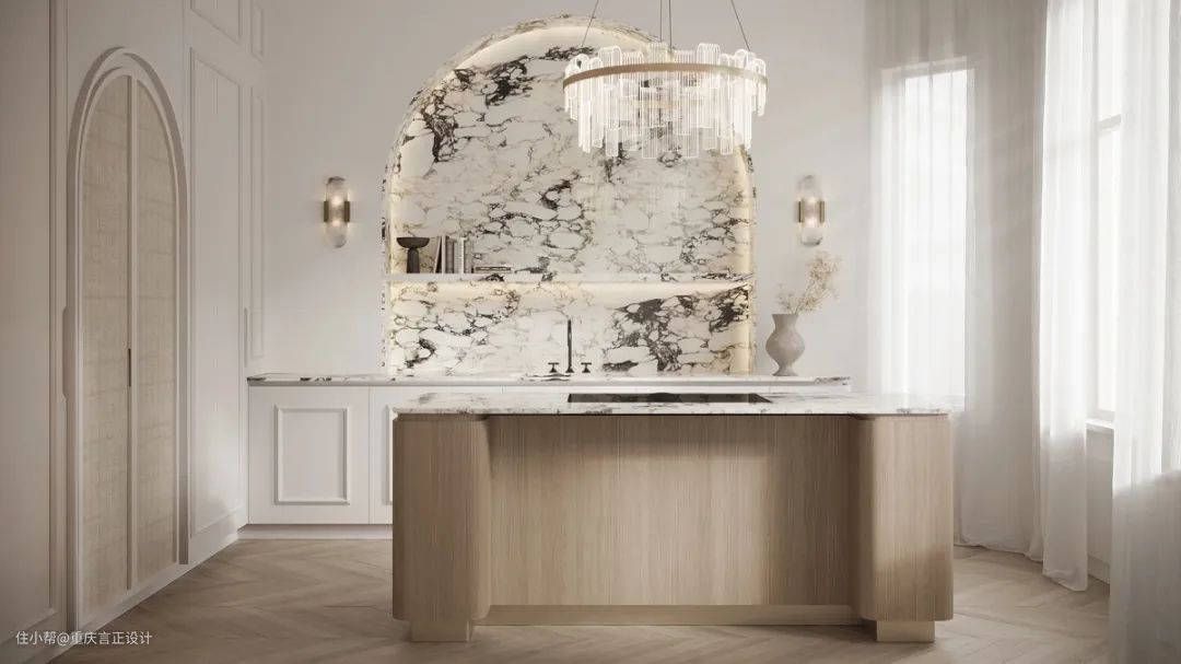 这大理石厨房以稀疏的纹理营造出低调的背景。一个白色的厨房岛延续了干净的外观,还有一盏全白的雕塑吊灯。