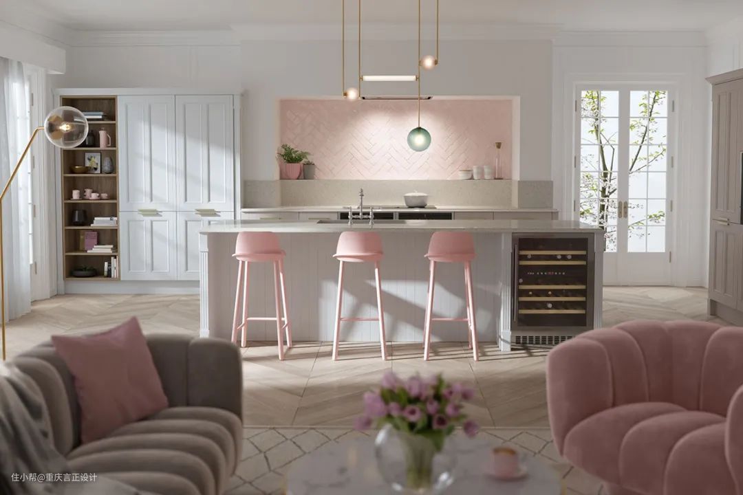 或者,柔和的色调是一个更微妙的选择粉色厨房。