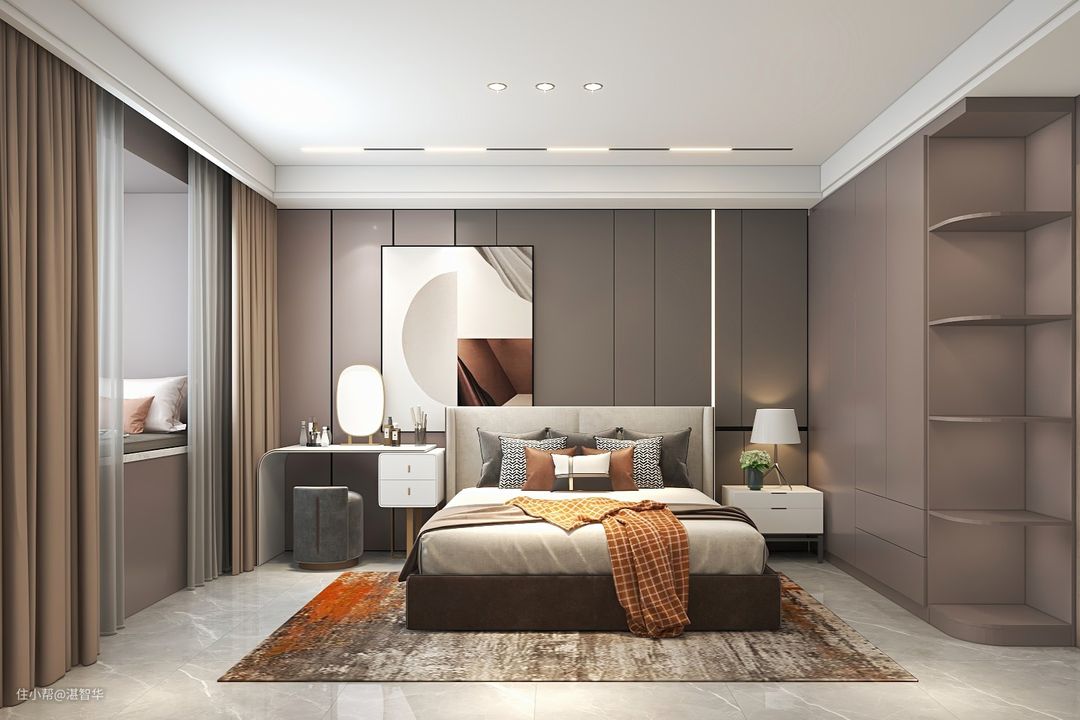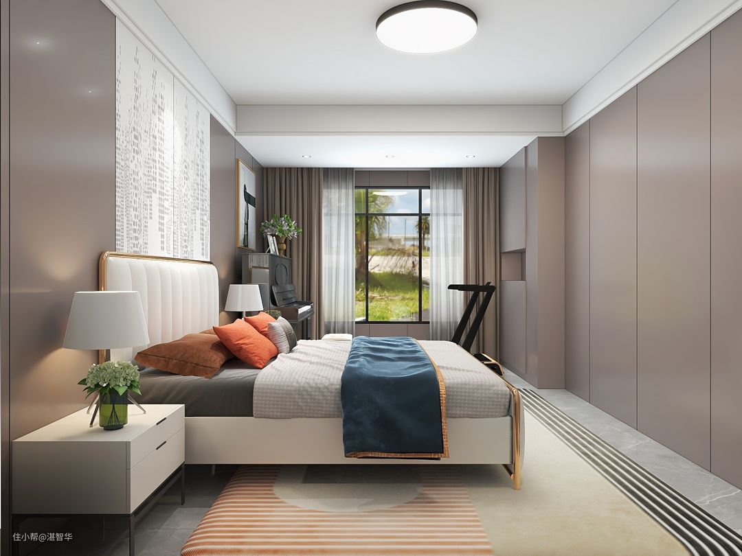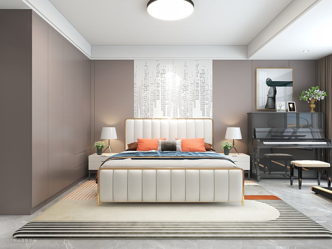 床尾是驼色柜子一面柜子,与所有墙面的木饰面颜色一致,真皮床布置床单与抱枕,带来简约舒适的睡眠体验,旁边放置钢琴,让空间显得简洁优雅。