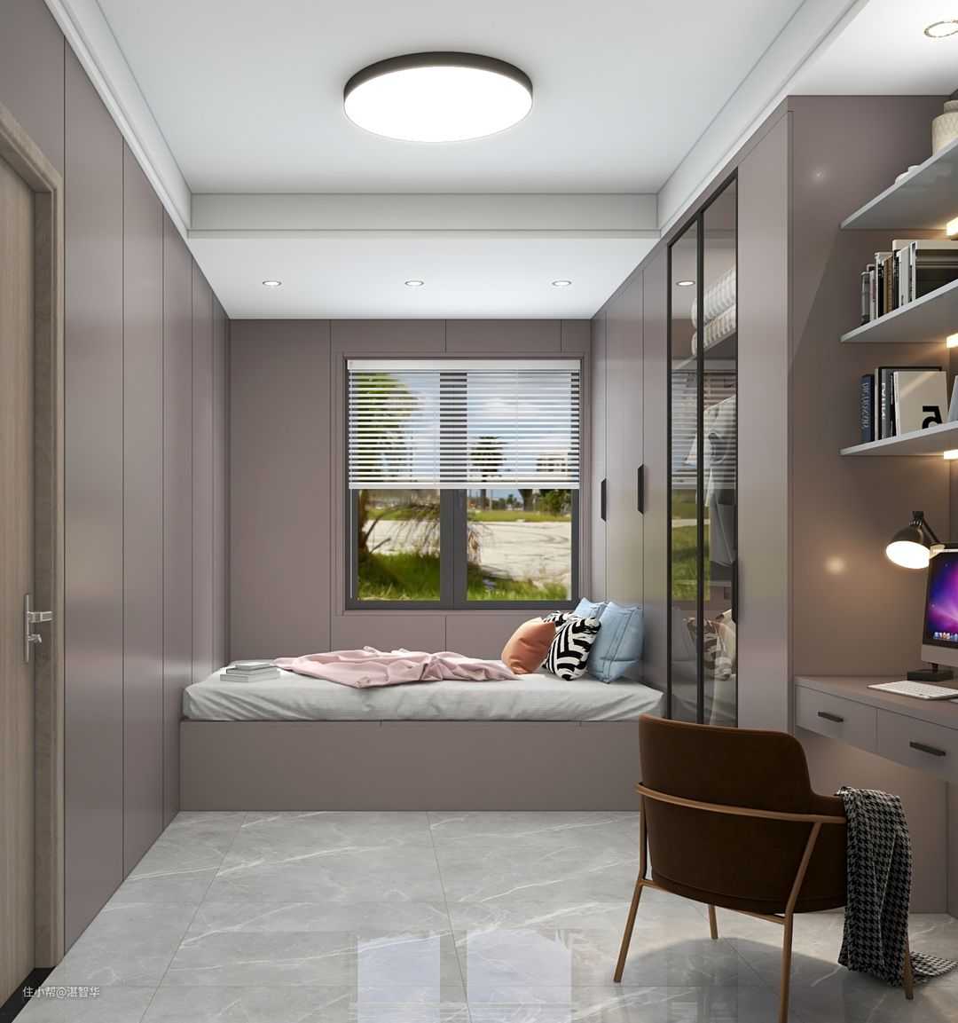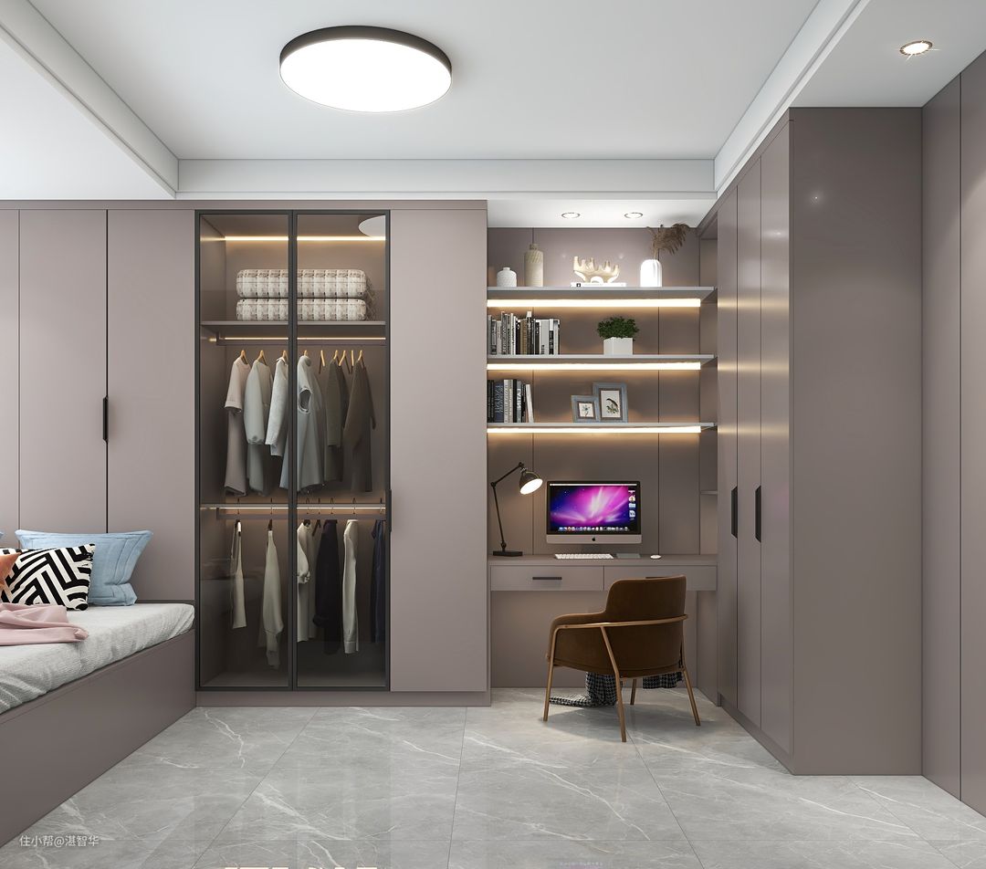 儿童房做榻榻米加书桌柜子连贯,搭配灰色简约的床单,整个空间显得简约舒适而惬意。