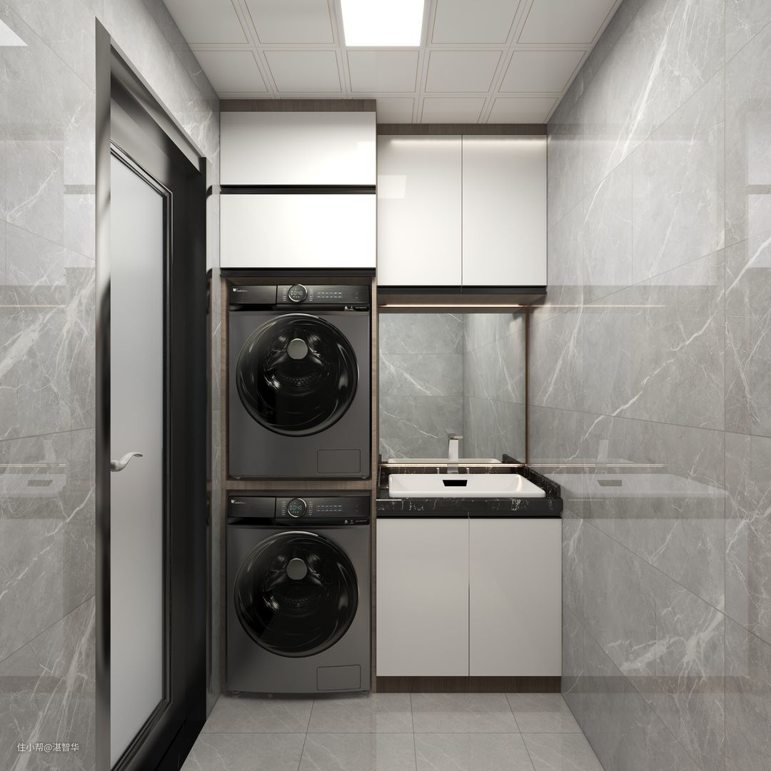 顶天立地的洗衣柜,洗烘分体式机寿命长,右边是洗手台和储物柜,分布合理!