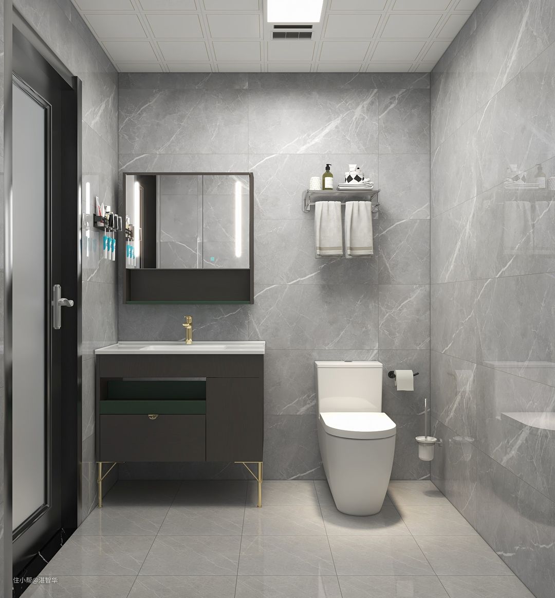 卫生间灰色墙砖和地砖通铺,看起来整体大方而且耐脏!