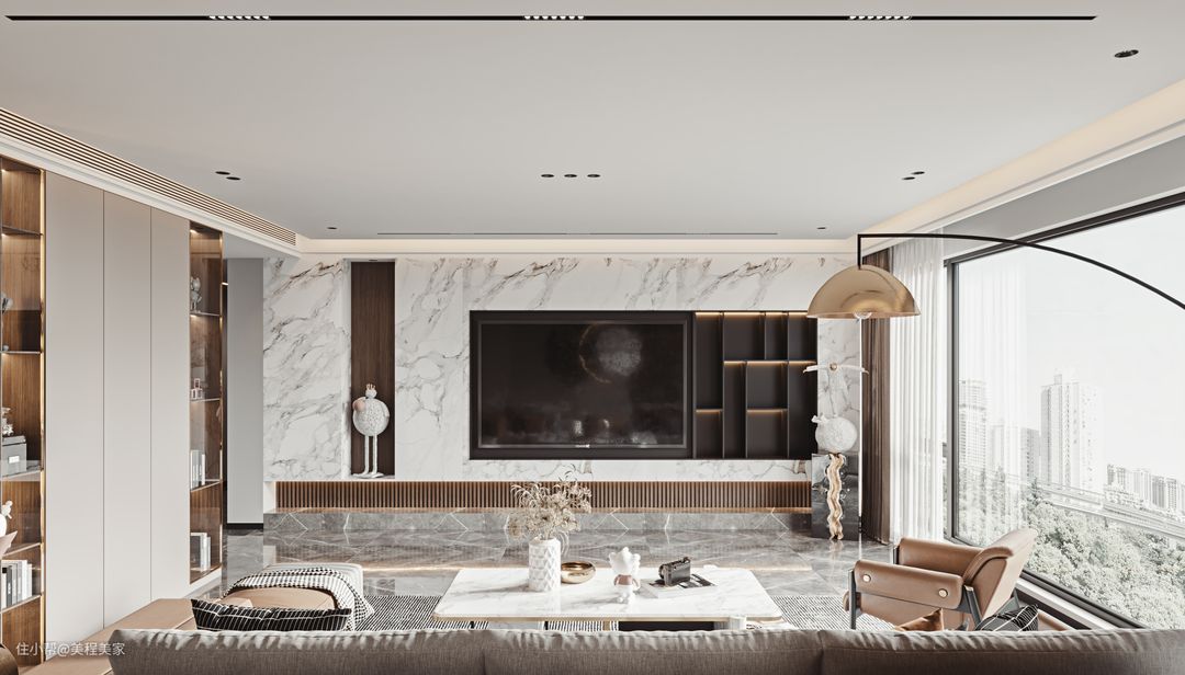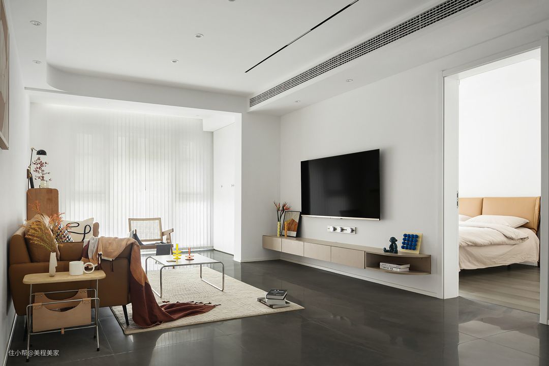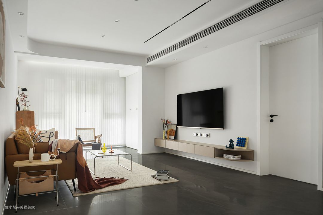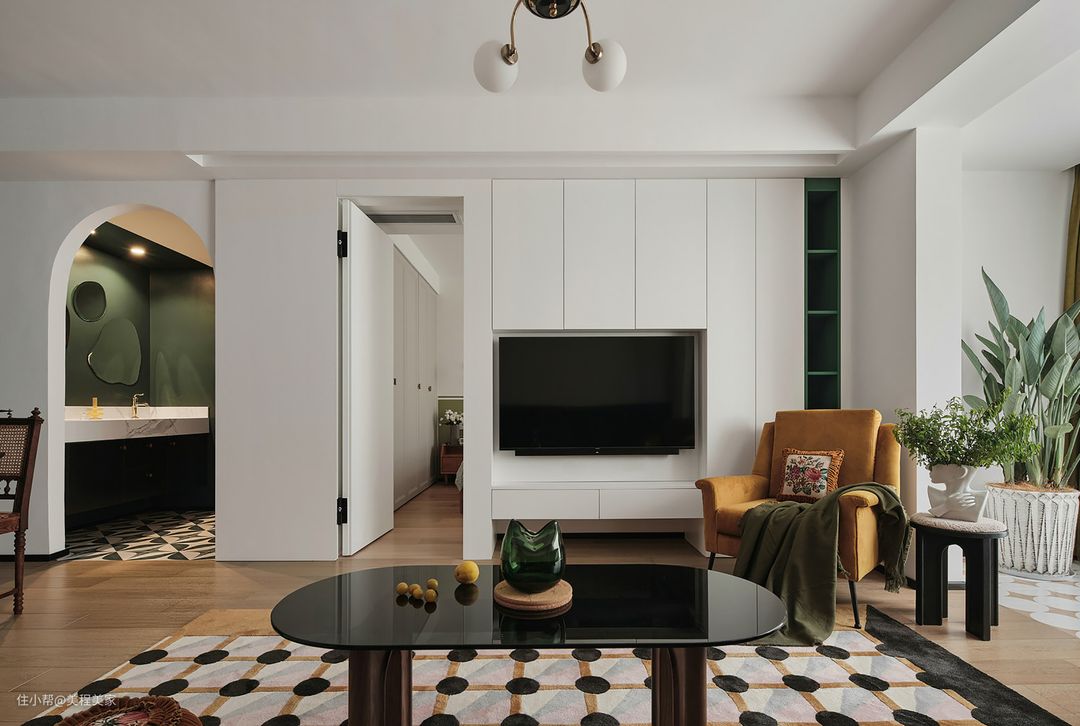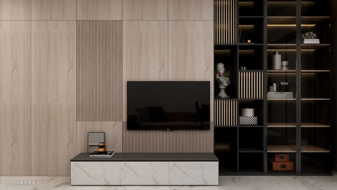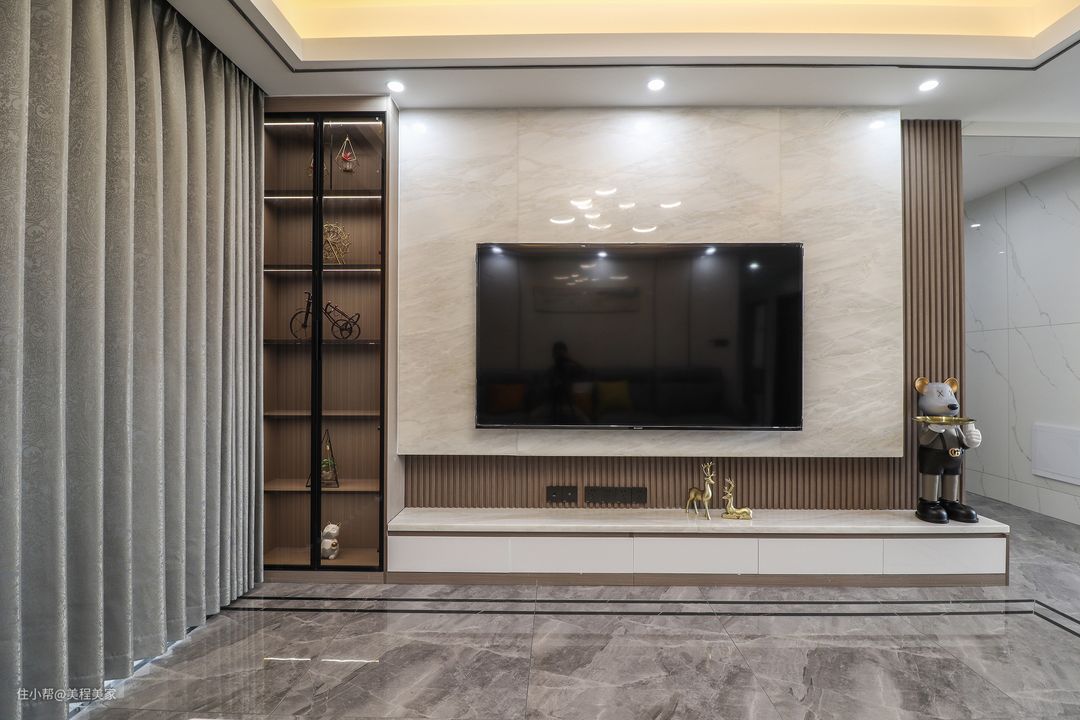 成品电视柜是之前装修时最常用的方式,如果觉得定制设计太过繁琐了,可以将电视背景墙空间预留出来,后期根据设计风格与需求来购买成品电视柜进行搭配:木质款、岩板、玻璃组合。