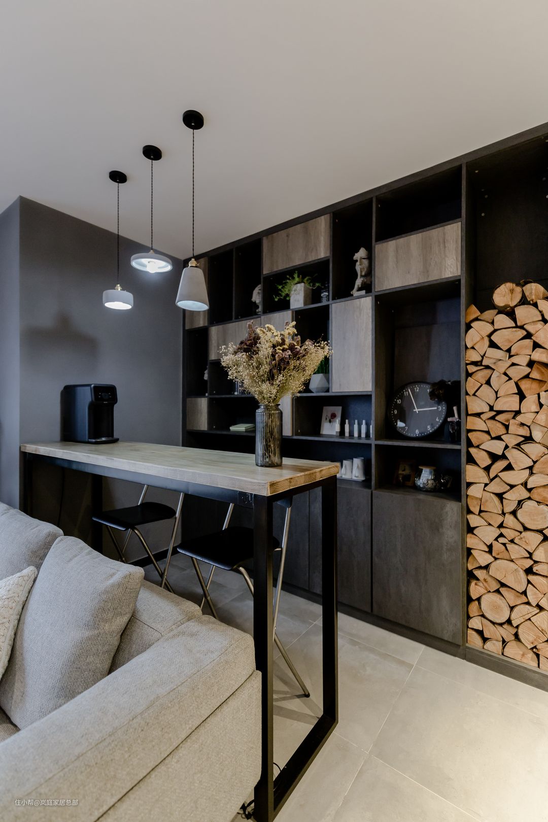 而且在墙面的设计上,我们可以做更多的收纳,像图中这样的组合形式的书柜,开放格和封闭式合理搭配的设计,它可以是书架,也是展示架。在一侧加入天然的原木桩子做填充,让空间的风格和质感立马变得不一样起来,实用颜值并存。