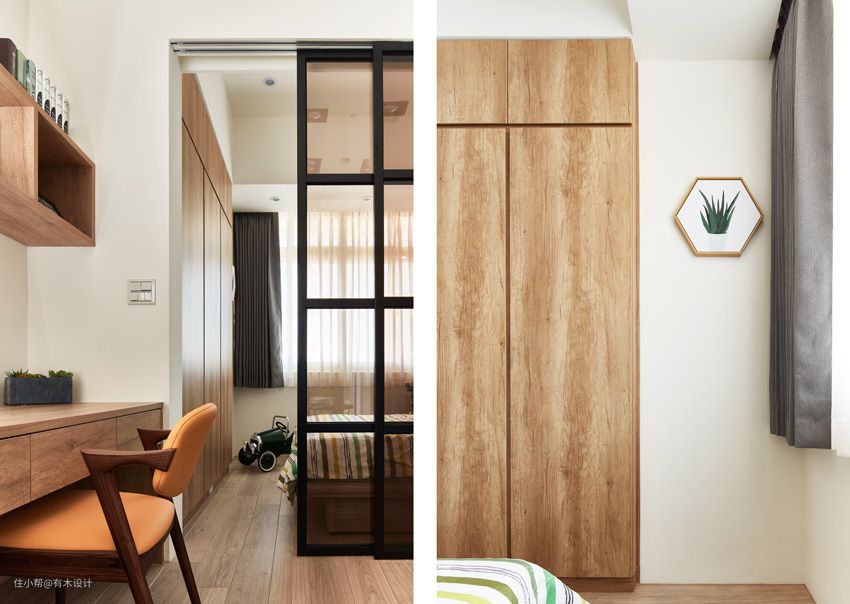 因为太太比较早睡,先生晚上在客厅看电视时怕吵到妻子。设计师便在此安装黑框拉门,特别选用茶色玻璃衬托室内温暖氛围,也能稍微降低白天卧室侧的亮光。