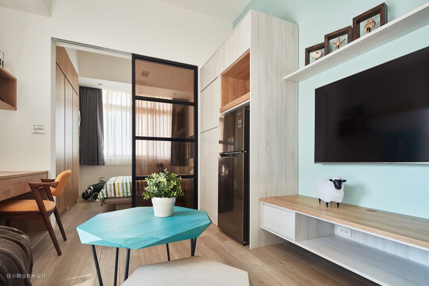 客厅到卧室的过渡区是两人用餐、工作用的空间。设计师选用轻巧的茶几,方便随时搬动。电视墙左侧规划木质收纳高柜,并将容量充足的冰箱安置于此,不局限于厨房空间;冰箱上方设计一个跳色柜格,感觉更加活泼。明亮的窗台旁也规划贴墙的工作桌面,无桌脚设计更方便清洁。