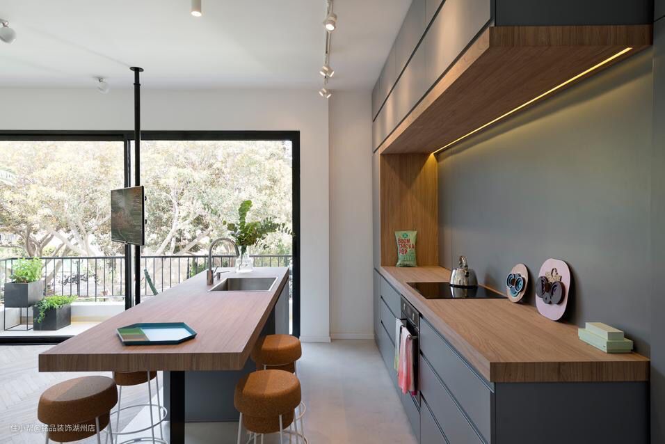 (3)与厨房结构咬合的形式也是延伸之外的体感元素,所以可以创造出更为多样化的形式感与几何感,大家也可以认为这是设计的解构与重组,如将操作台扩展出吧台,墙体收纳格也可以凸出吧台等,这些作为空间的的元素,都能创造出非同一般的功能性。