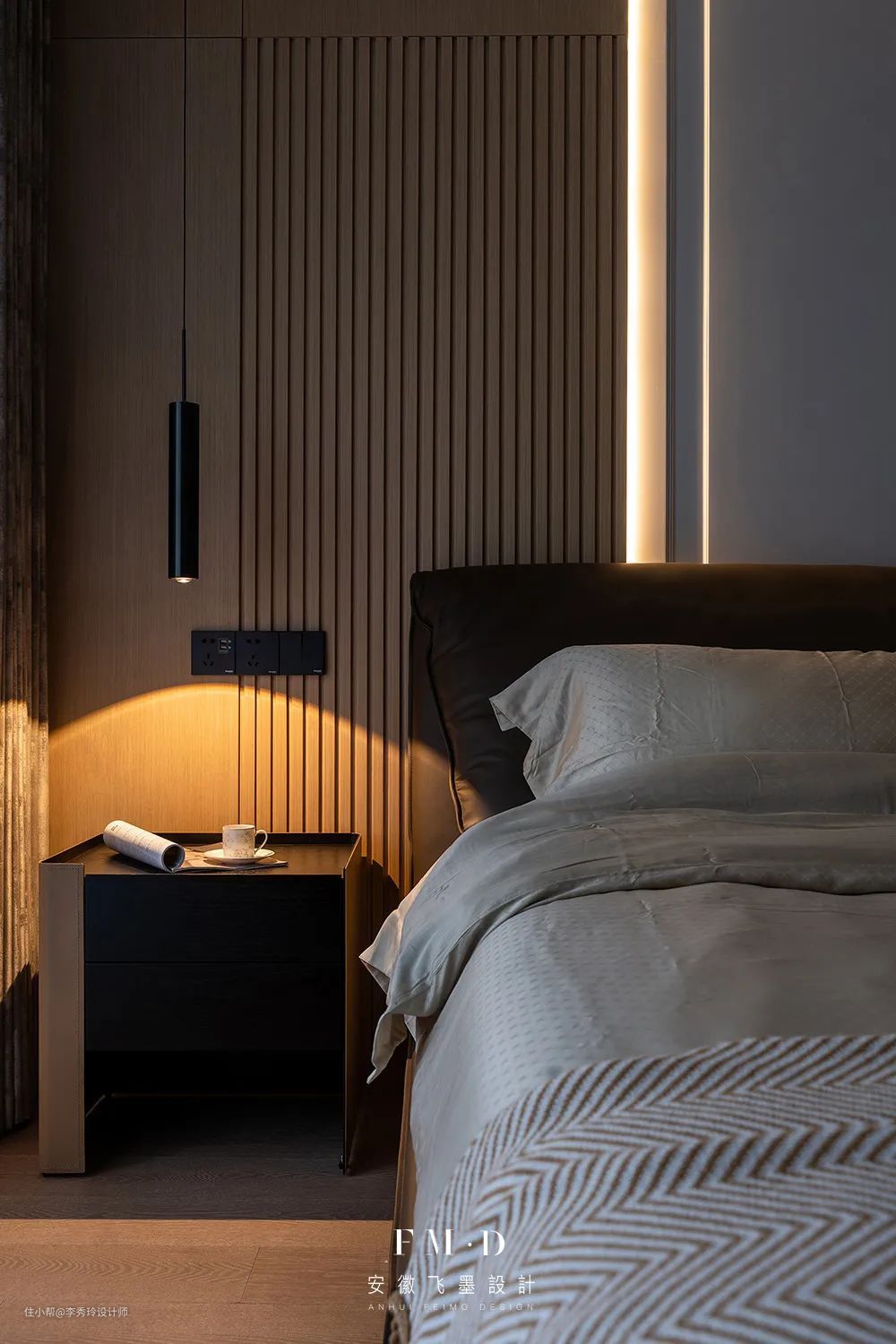 尤其是床头的壁灯,一定要选择微弱的暖光,可以让人快速入睡。此外,如果是地台床,可在床边做隐藏式的灯带,弱化家具的体积感,让家具显得更轻盈: