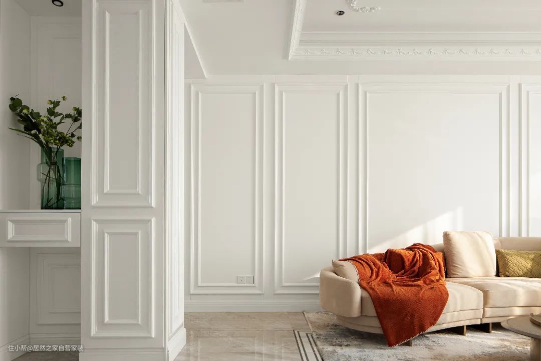 空间整体风格定位现代法式,洁白无瑕的空间基调在石膏线和墙板线条的勾勒后优雅呈现,尊贵的皇室绿和莫兰迪的灰及灰粉色使整体空间格调在复古中透着奢华的品味。