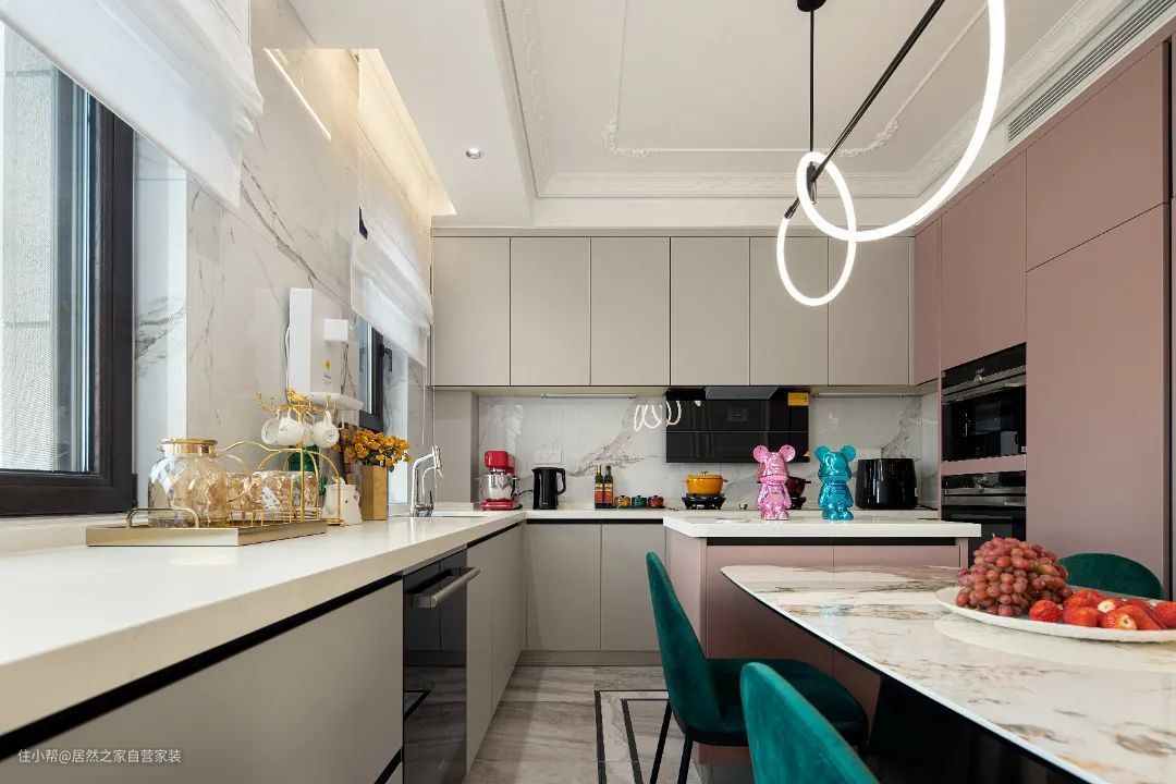 厨房采用开放式的设计,厨房餐厅融为一体,开阔、自在,莫兰迪色系的粉色和灰色营造出优雅精致的就餐空间。