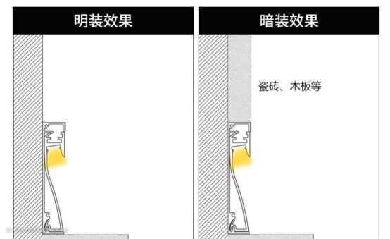 根据安装方式,踢脚线灯可以分为明装和暗装两种,区别在于前者是在整体装修完后直接将成品踢脚线灯安装在墙角处,后者需要在硬装施工时开槽预埋。