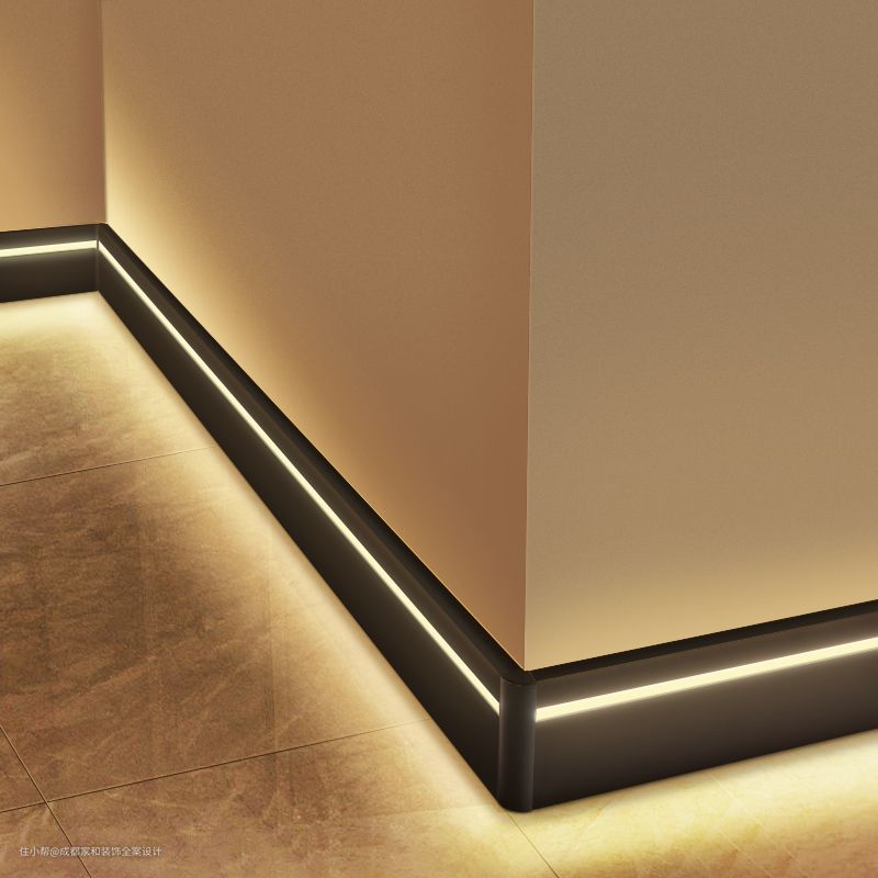 踢脚线灯可以在硬装中开槽加入灯带,也可以直接购买成品踢脚线灯产品进行安装,无论采用哪种方式,都必须在设计阶段明确设计方案和尺寸,避免出现任何不合理的地方。