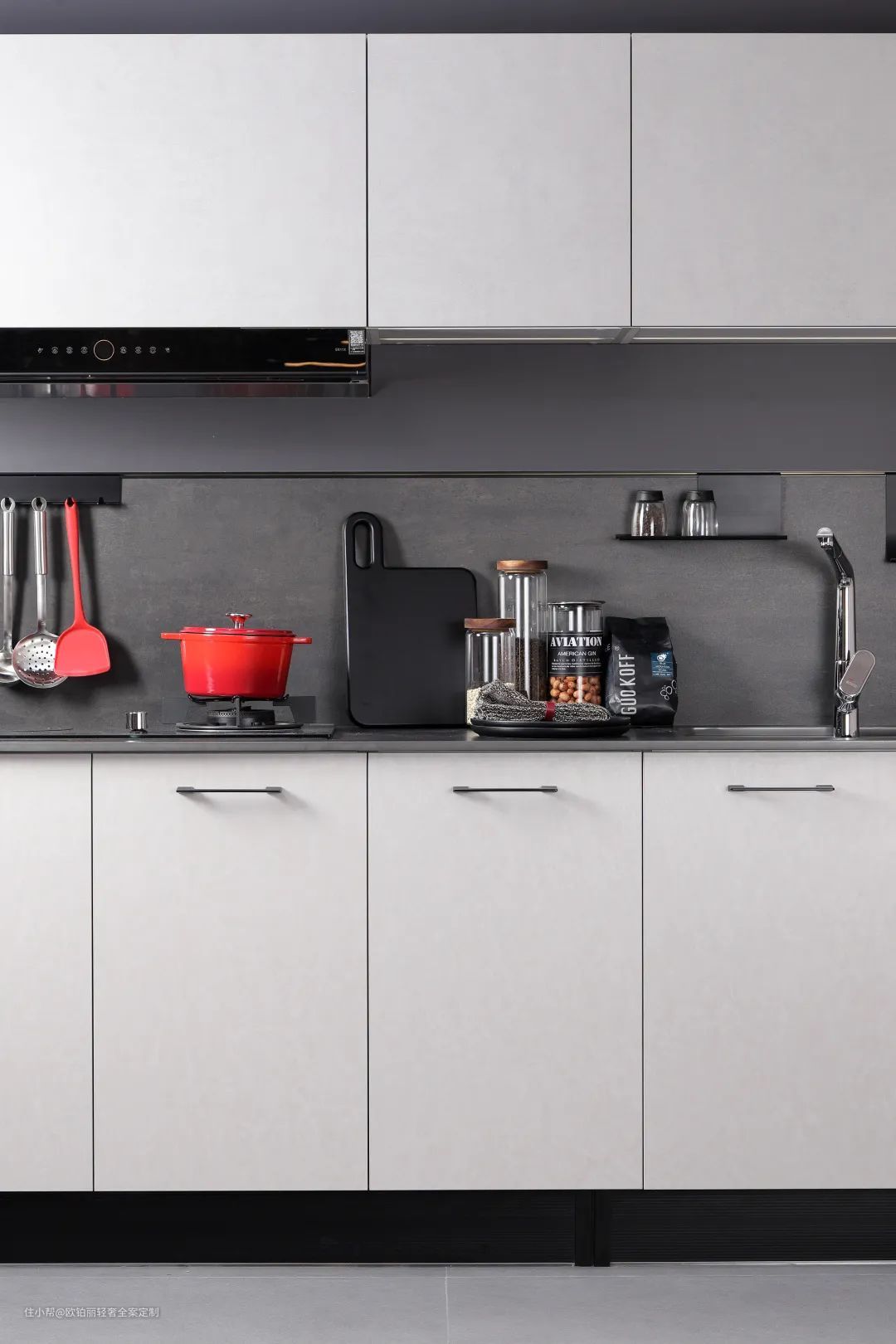 吊柜做到顶不仅可以增加储物空间,还不容易落灰。但将吊柜设计成上不接顶,使用时间一长,油烟加落灰就会变得又黏又黑,难以打理。