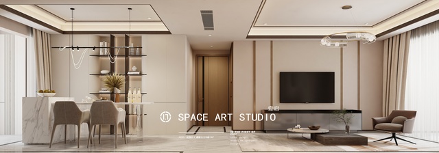 客厅吊灯内嵌灯带,吊灯和落地灯的加入营造多种氛围的灯光体验,落地窗将自然光更好的引入空间中,就算不开灯整个房间也是暖暖的