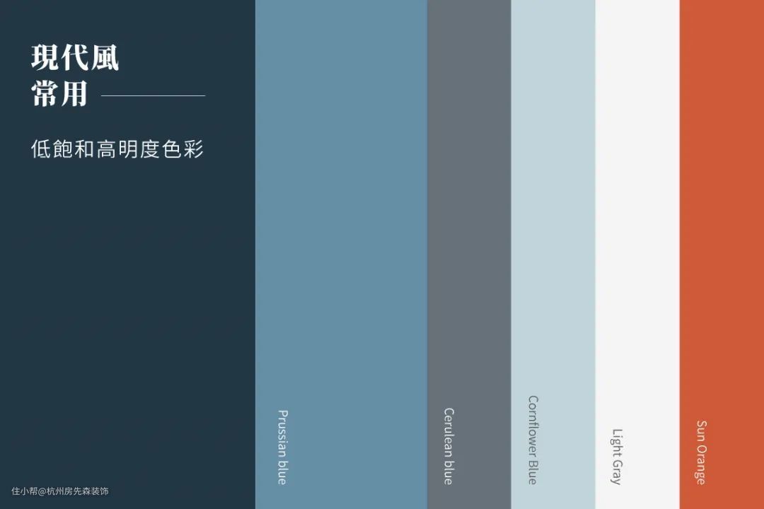 现代风都会选择单一素材配色为主,有别于先前很热门的工业风、Loft风采用深色灰调,现代风更多运用低饱和高明度的浅色调(莫兰迪色)。