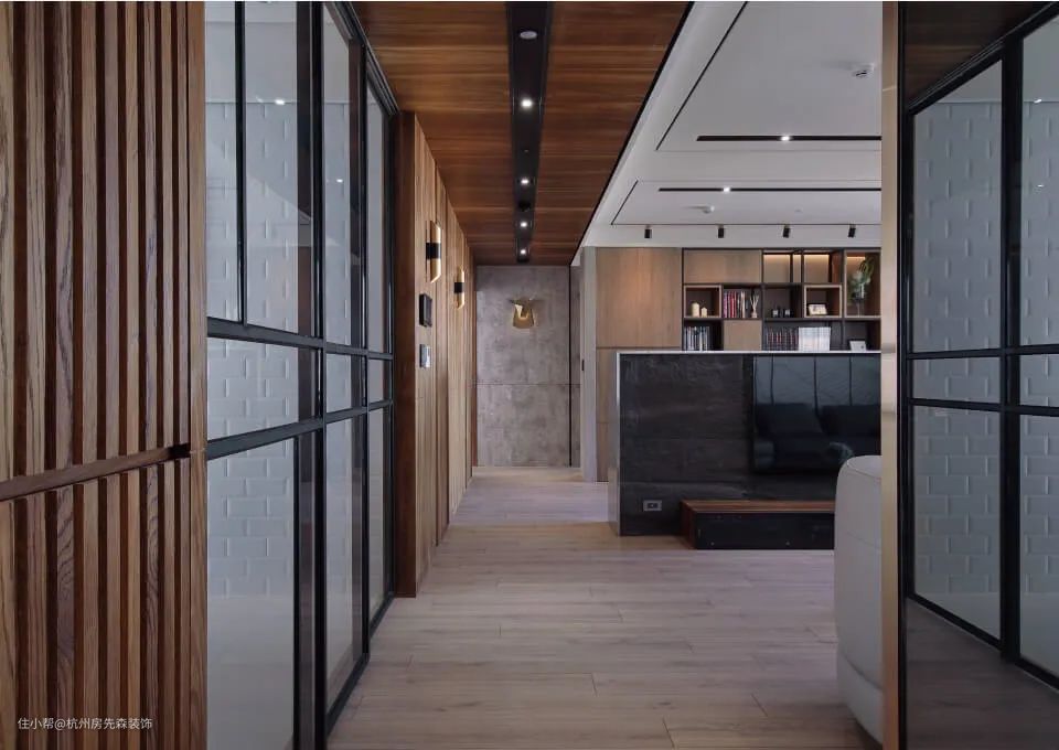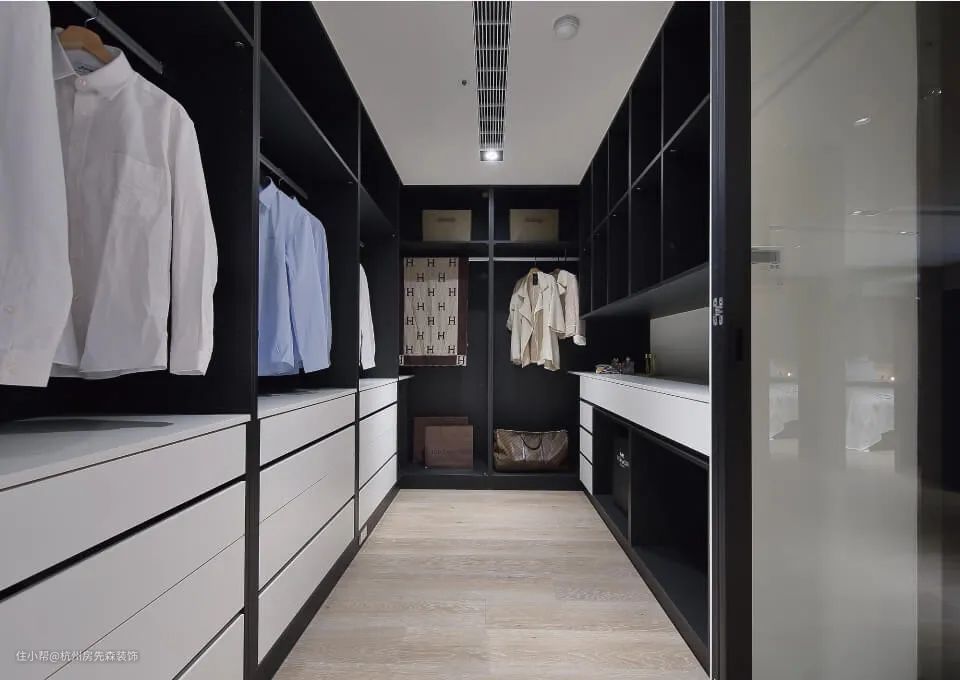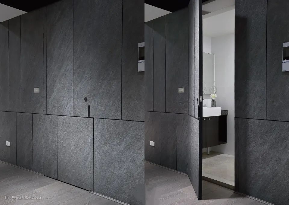 现代风时常利用玻璃、镜面等元素,点缀整体空间,不仅能增加视觉开阔感,同时也能替空间提供一定程度采光(或折光),使整体空间更显明亮宽敞;相对地,收纳机能上也不马虎,为呈现简洁利落,通常会舍弃传统带门把式平开门,改用一致性隐藏式推拉门,并于门后设置收纳空间,提升居住机能性。