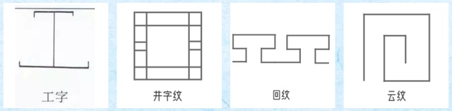 在工字纹上的调整和变形,这些都是演化自青铜器上的云雷纹,和古代的祭祀祈福相关,通过横线竖线相交回环相扣,图案可以无限延伸。