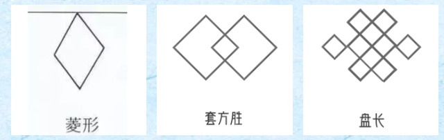 三个纹样,都是在基础的菱形上做变化而来。菱,菱角,大自然的丰富馈赠,而菱格也是渔网的形状,网罗财富。同时,两个菱形压角相叠又称为同心方胜,寓意心连心,象征男女之间坚贞的爱情。