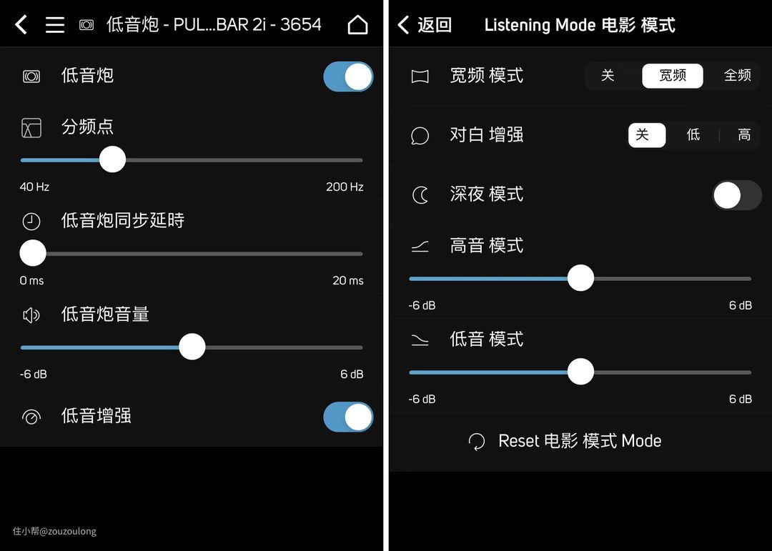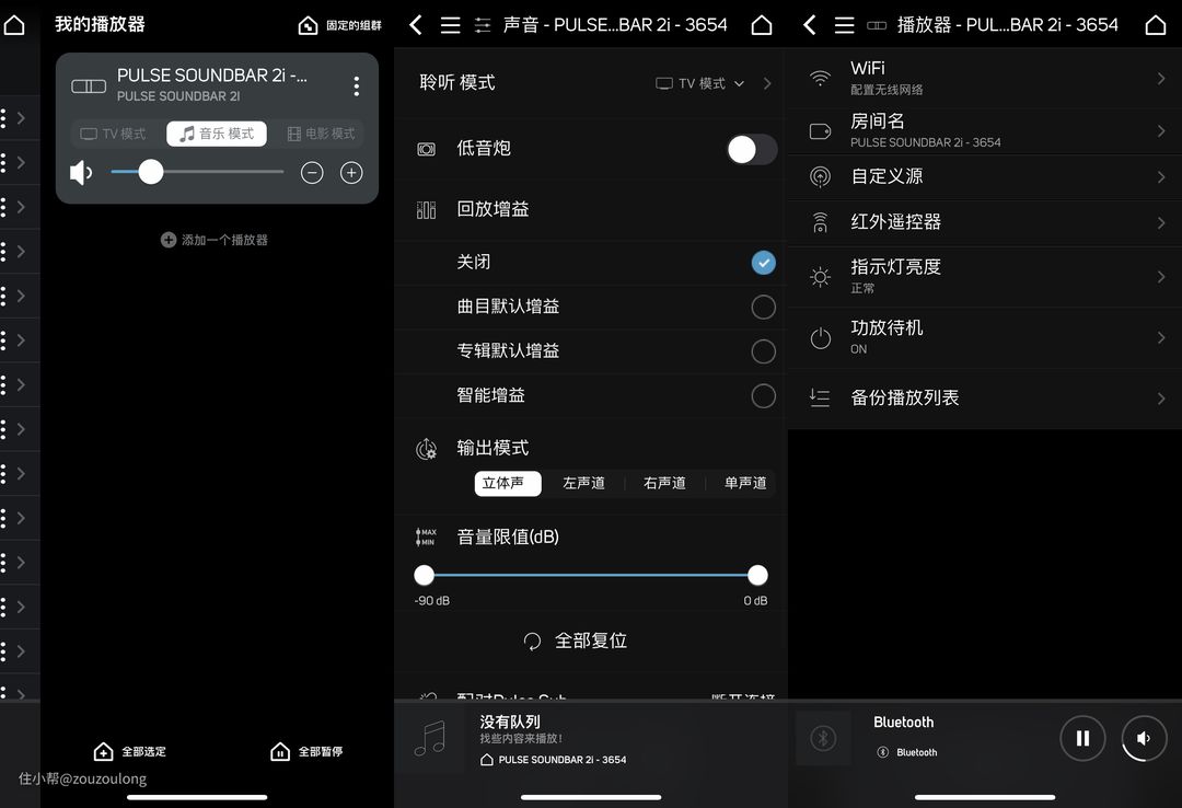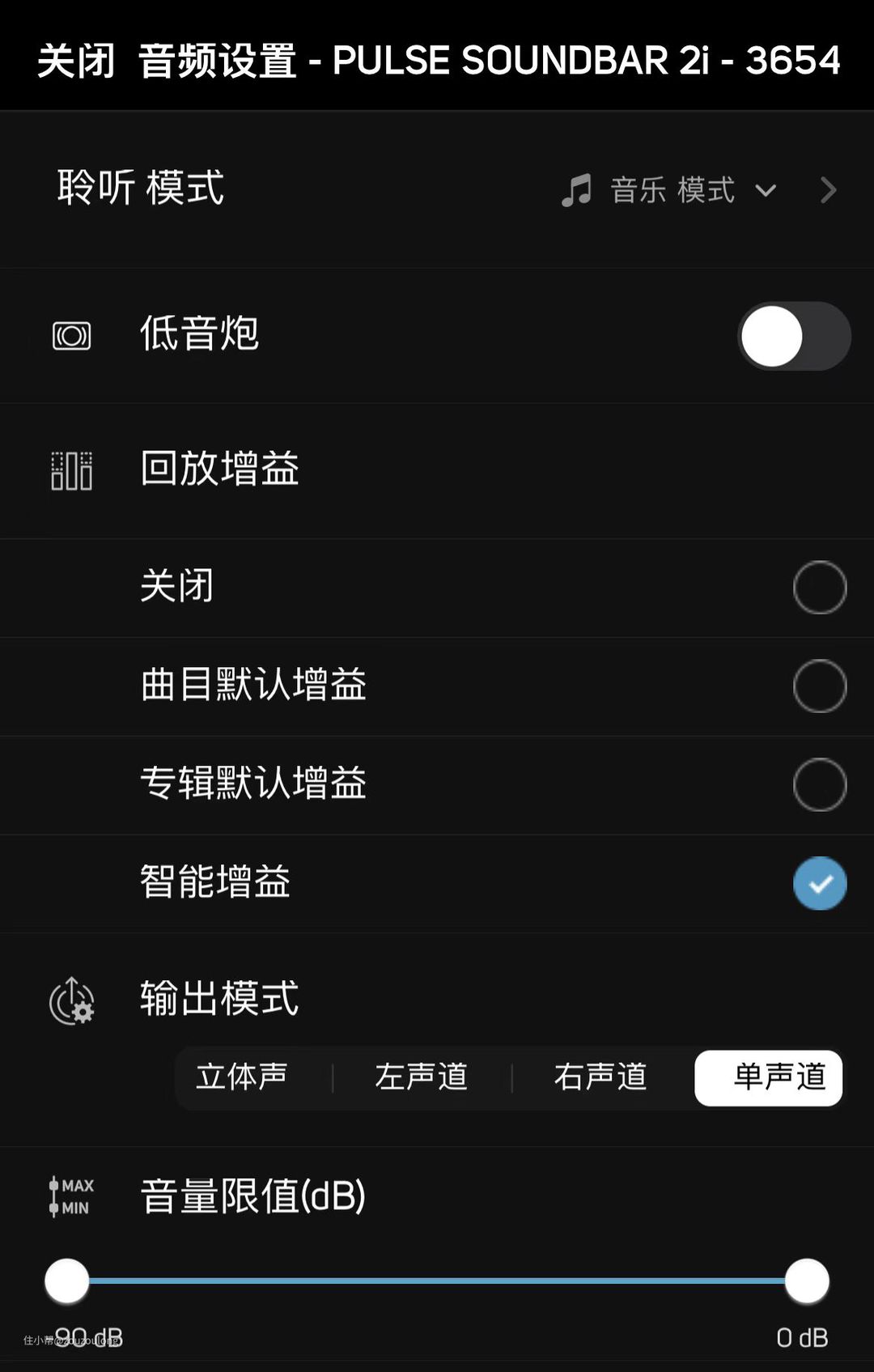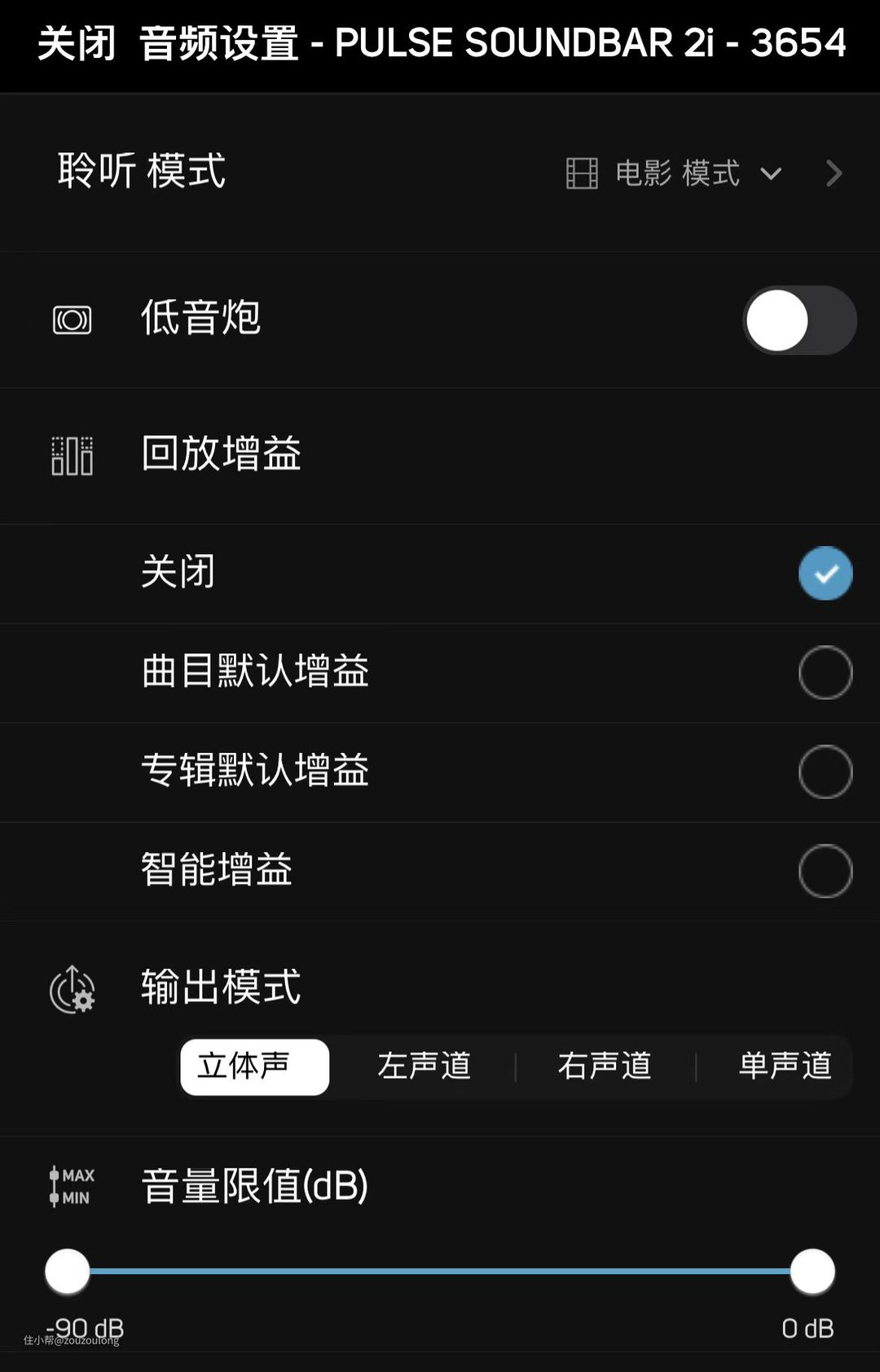 App也可以进行TV、音乐和电影模式的切换,并进行低音、增益、声道等细化的参数调节。
