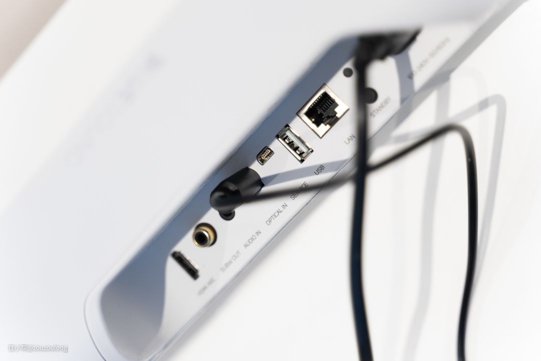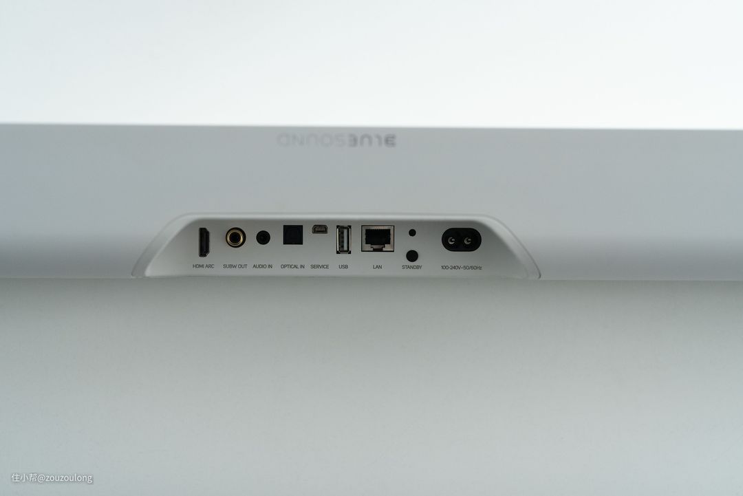 接口槽做了内陷处理,这样的话,在摆放回音壁时,就不容易磨损和沾灰。从左到右的接口分别为HDMI ARC、SUBW OUT(重低音输出)、AUDIO IN(音频输入)、OPTICAL IN(光纤输入)、SERVICE(检修口,供工作人员使用)、USB、 LAN(网线口)、STANDBY(备用口)、100-240V~50/60Hz(电源插口)。