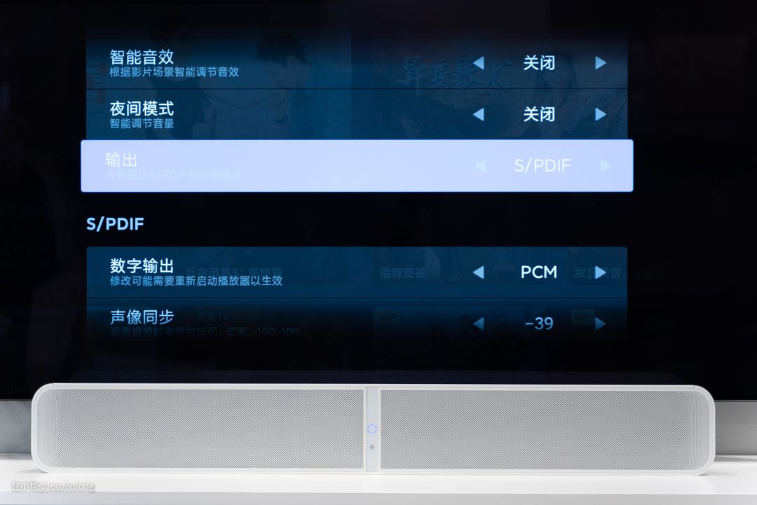 电视上可以实时显示当前的输出源(电视的输出,自然是回音壁的输入),看上去还是很直观的,也能进行数字输出、声像同步等多项模式、参数的调节。
