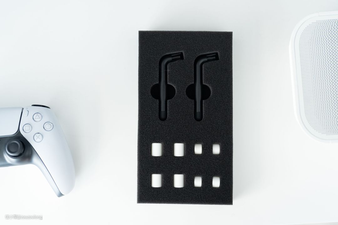 BLUESOUND SOUNDBAR 2i随机附送了六根线、两根音箱立式支架和安装支架需要用到的垫片(白色的圆柱物体)。