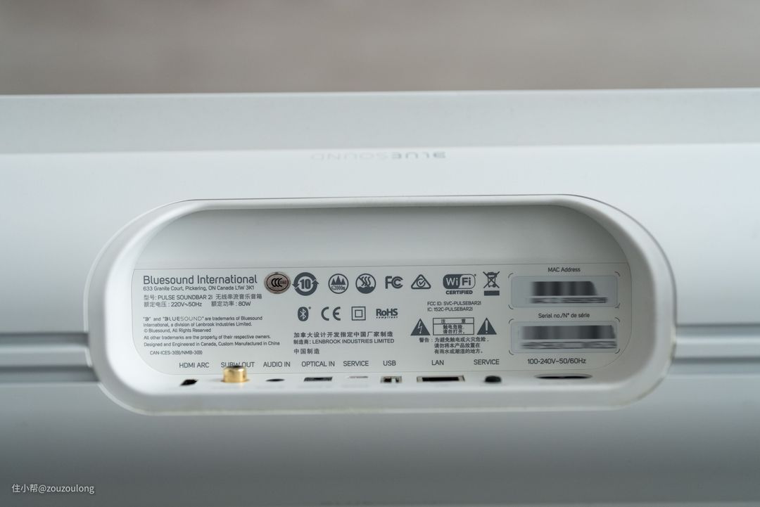 接口侧可以看到丰富的图标,包括一些主流的认证标准,以及功能角标。有一个信息值得关注,BLUESOUND SOUNDBAR 2i的额定功率80W,电耗比较的低。