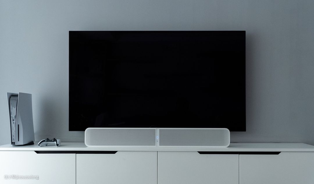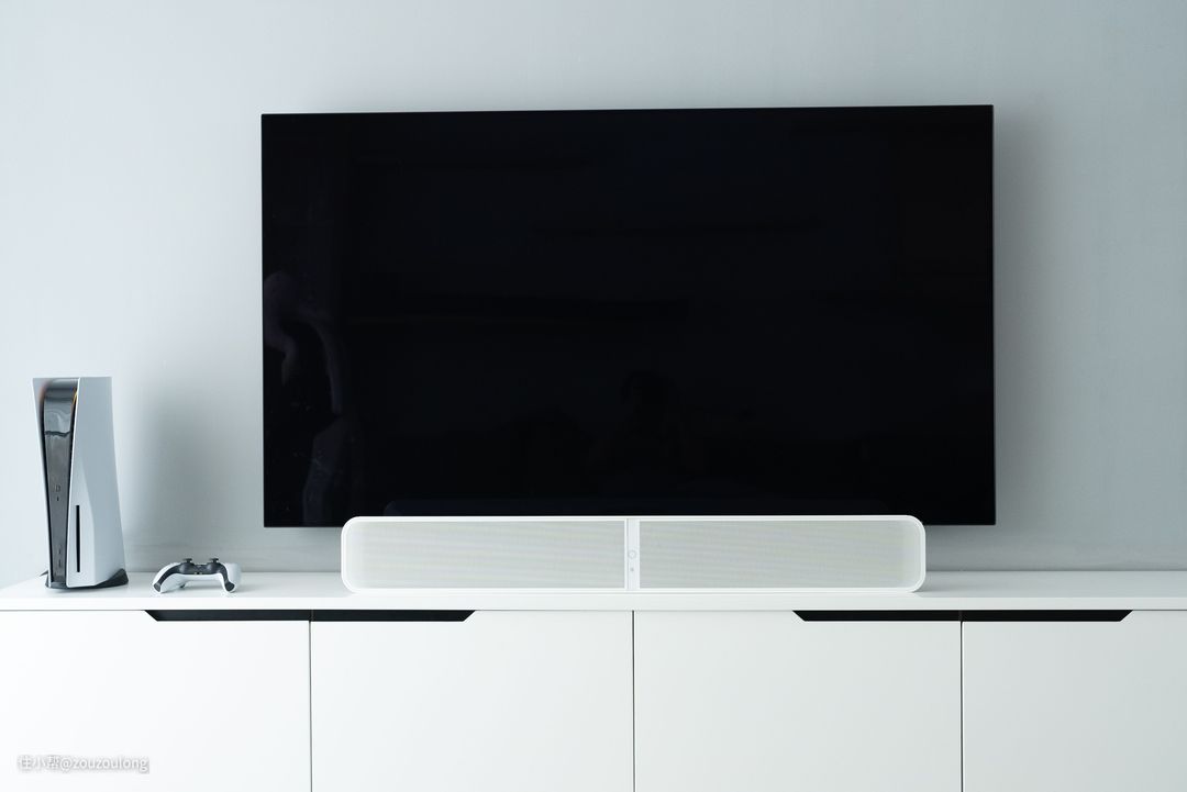 BLUESOUND SOUNDBAR 2i共磨砂黑和磨砂白两种配色,尺寸1073×141×70mm,重6.8kg。我的这款是磨砂白配色,与家居更为百搭,和纯黑的电视的视觉反差也是我喜欢的。