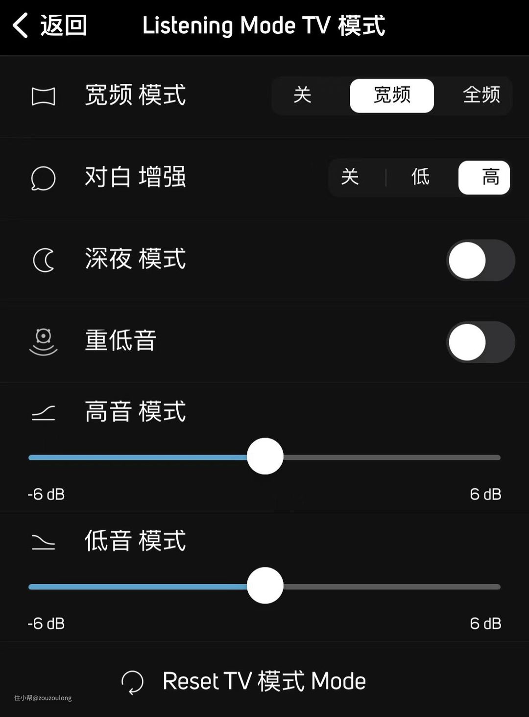 TV模式我的主要感受是对白增强比较实用,比如我妈年纪也大了,平时看电视可能听起来有点费劲,开个对白增强,也不用把电视调到震天响,就可以正常看了。深夜模式就适合我这个夜猫子了,晚上追个剧,也不用担心吵到老婆(主要是我不抗揍)。