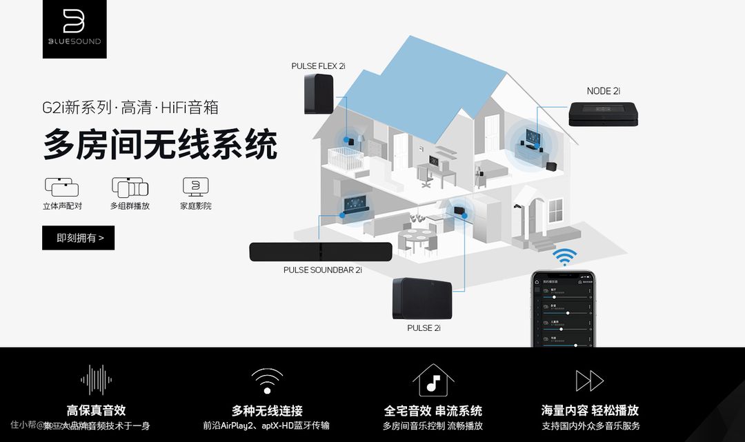 当然,BLUESOUND的音箱产品本身素质也很能打,BLUESOUND由发烧级的无线扬声器和数字播放器组成,可以将多格式的本地音乐,以及多种在线音乐服务平台上获得的音乐和各类游戏(PS、XBOX等)、影视音频(蓝光电影、电视综艺),以24bit/192k的高清素质,无损地串流播放到家居空间的各处角落。