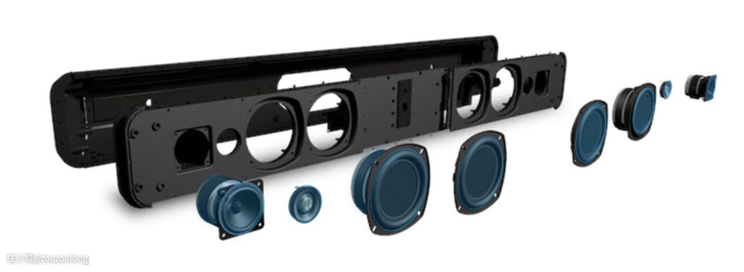 SOUNDBAR 2i采用了8个发声单元,包含两个1英寸25mm高音单元、两个2英寸50mm中音单元、两个4英寸102mm低音单元以及两个4英寸102mm被动扩音器(相当于普通音箱的倒相管,减少失真),峰值功率400W,频响范围55Hz-20KHz。