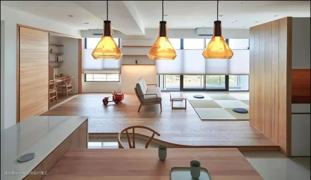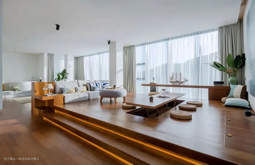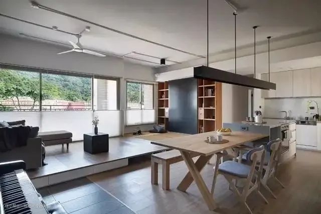 抬高地台,其实是用一种堪称巧妙的设计手法四两拨千斤的将空间划分开来。