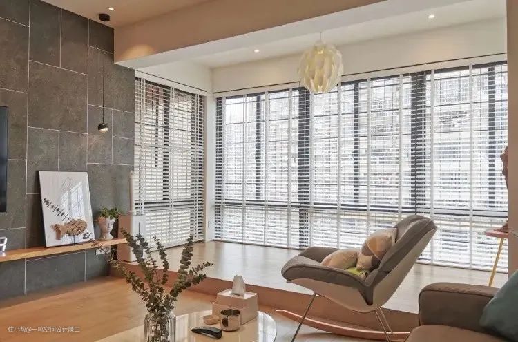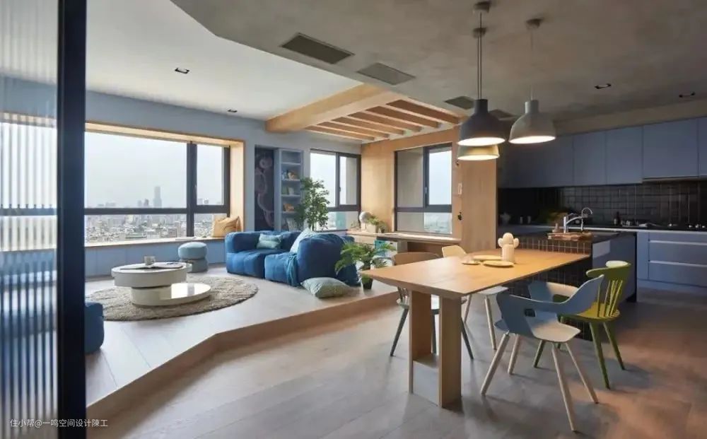 客厅作为一个整体来抬高做地台设计,一般出现在原来的房型属于大横厅的类型,但是并不想要客餐厅一体式空间。这个时候可以通过抬高地台,来对整体的空间做一个明确的划分。
