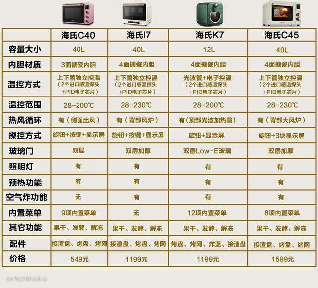 首先通过我整理的这张参数对比图,可以看出海氏家即便入门级的C40烤箱,在温控方面也配备了2个进口感温探头+PID电子芯片,最核心的温度精准度有保证,这就大大提高了新手的烘焙成功率。