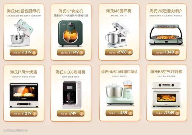 3月23-25日期间,海氏M5轻音厨师机1319元、海氏K7食光机1149元、海氏M6厨师机2780元、海氏V6无烟快烤炉1349元、海氏i7风炉烤箱1219元、海氏HC66咖啡机749元、海氏HM510料理和面机439元、海氏K5空气炸烤箱1349元,有需要的不要错过。