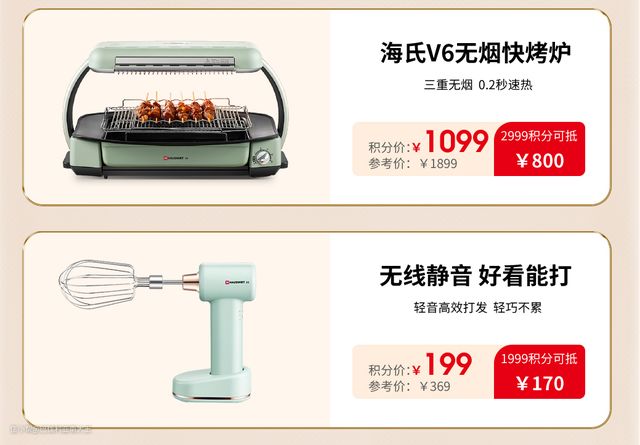 整体福利解析:活动期间会送会员专享券和积分,积分有两个作用。一是用积分可抽取100元大额优惠券,二是可秒杀换购用。这次海氏家的烤箱、打蛋器、厨师机、料理机等产品全线参与,参与秒杀的几款比站内历史促销价还低,有需要的值友及时入手。