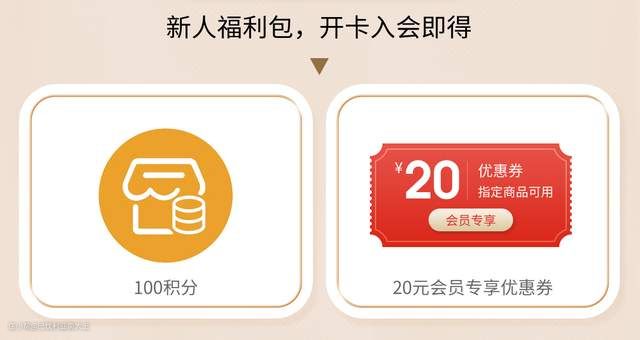 福利一:新人开卡入会,送100积分+20元会员专享券
