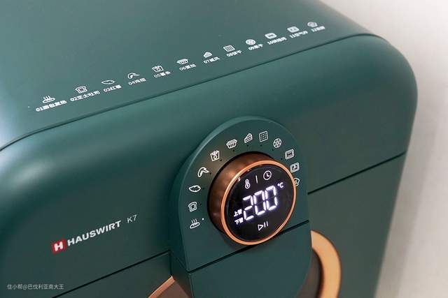 操作配置:旋钮+显示屏,旋拧时还会有“哆来咪发嗦拉西哆”的简单旋律响起。顶部有12个预设的菜单程序,对应的温度和时间都设置好了,可空气炸,可烤箱,功能多样。