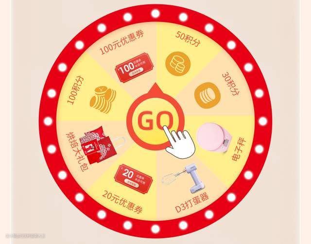 参与方式:转盘抽奖,奖品有“100元优惠券、20元优惠券、电子秤、D3打蛋器、烘焙大礼包、100积分、50积分、30积分”。